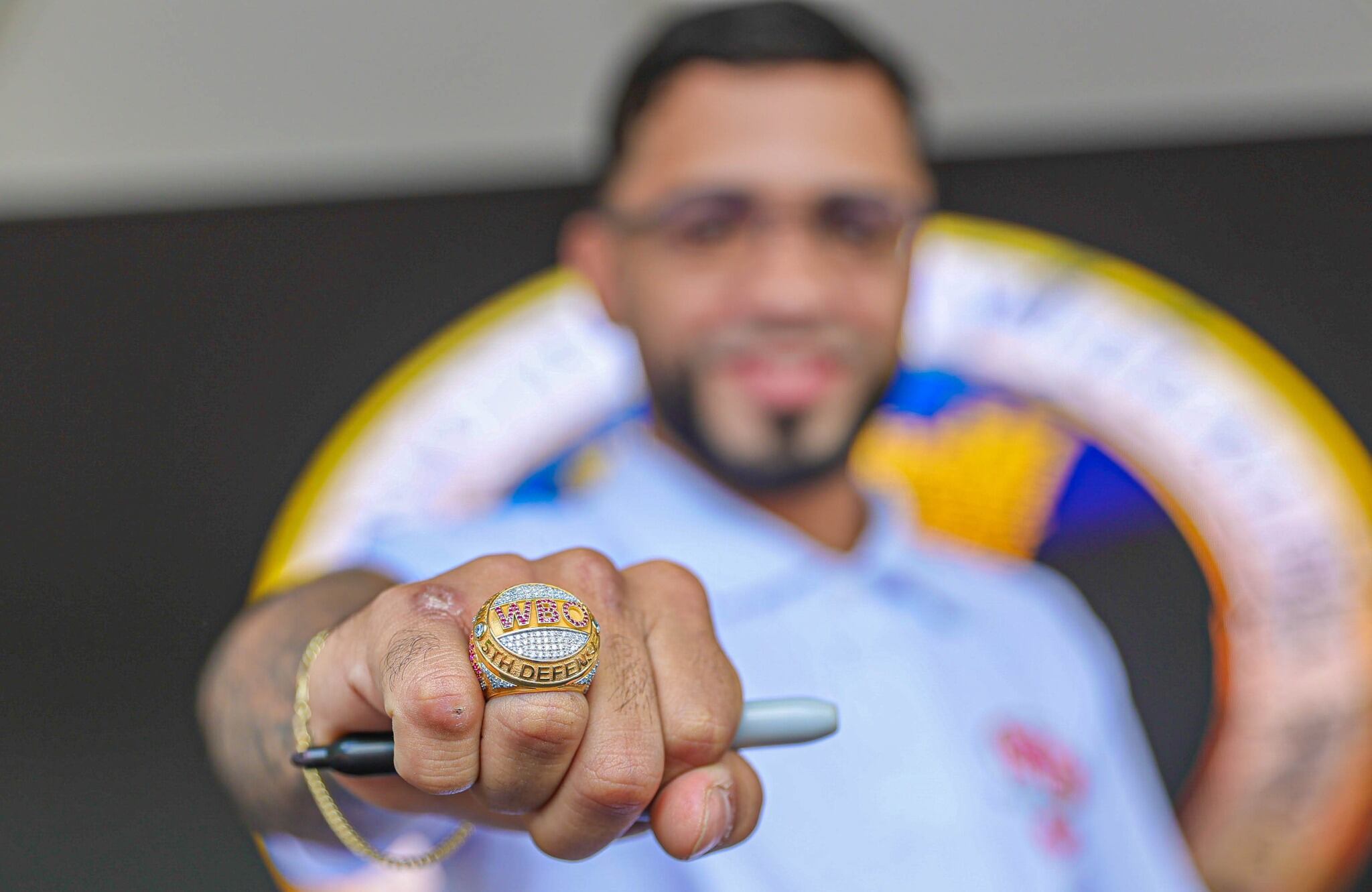 El pugilista puertorriqueño recibió la sortija rodeado de campeones y leyendas del ring, entre ellos el recién exaltado al Salón de la Fama Iván Calderón, el campeón peso ligero Keyshawn Davis, el campeón junior mosca René Santiago, y los excampeones Nelson Dieppa, Alex ‘El Nene’ Sánchez y Alberto Machado.