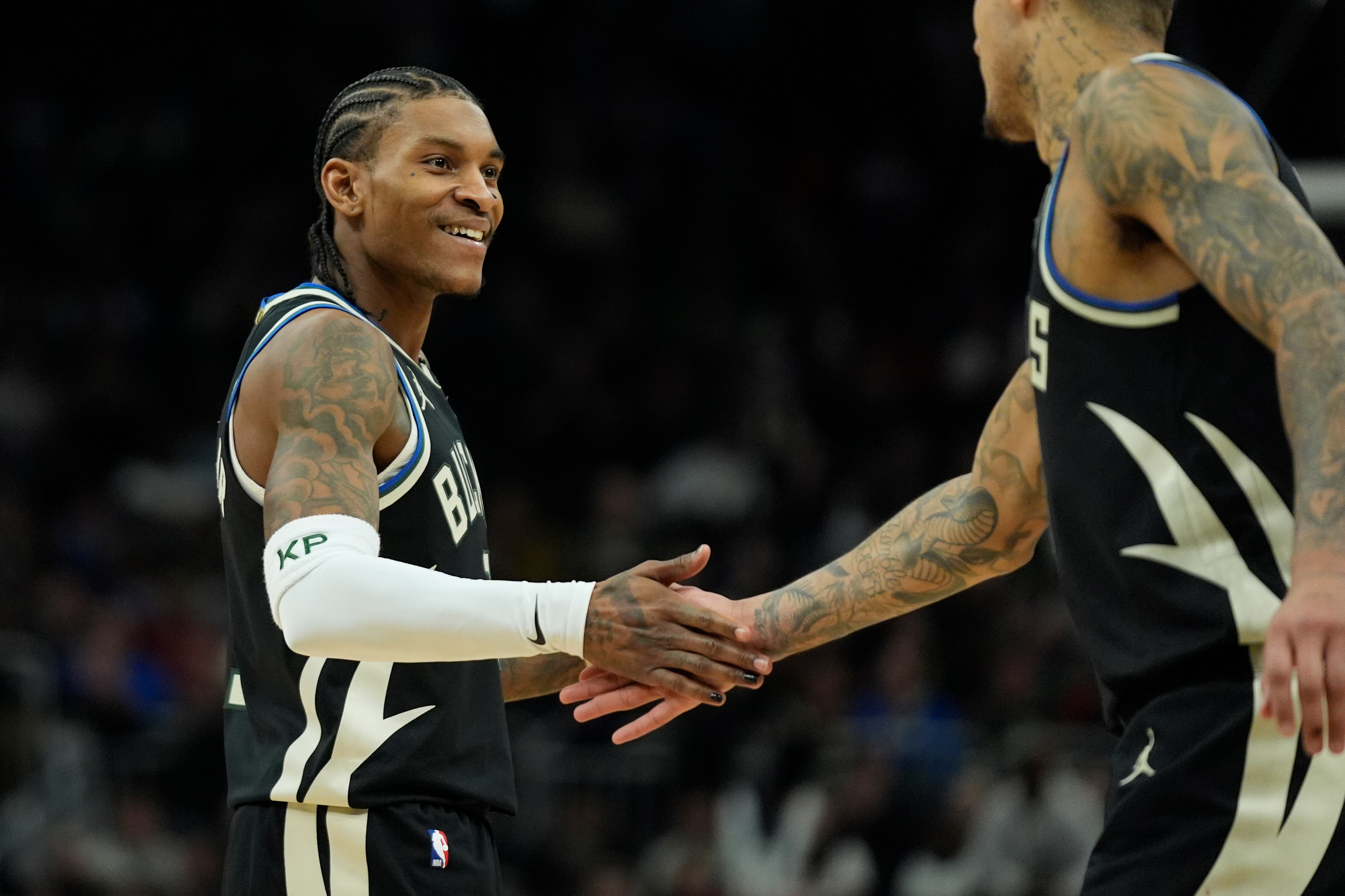Kevin Porter Jr., de los Bucks de Milwaukee, festeja con Kyle Kuzma durante el encuentro del jueves 10 de abril de 2025, ante los Pelicans de Nueva Orleáns (AP Foto/Aaron Gash) AP (Aaron Gash/AP)