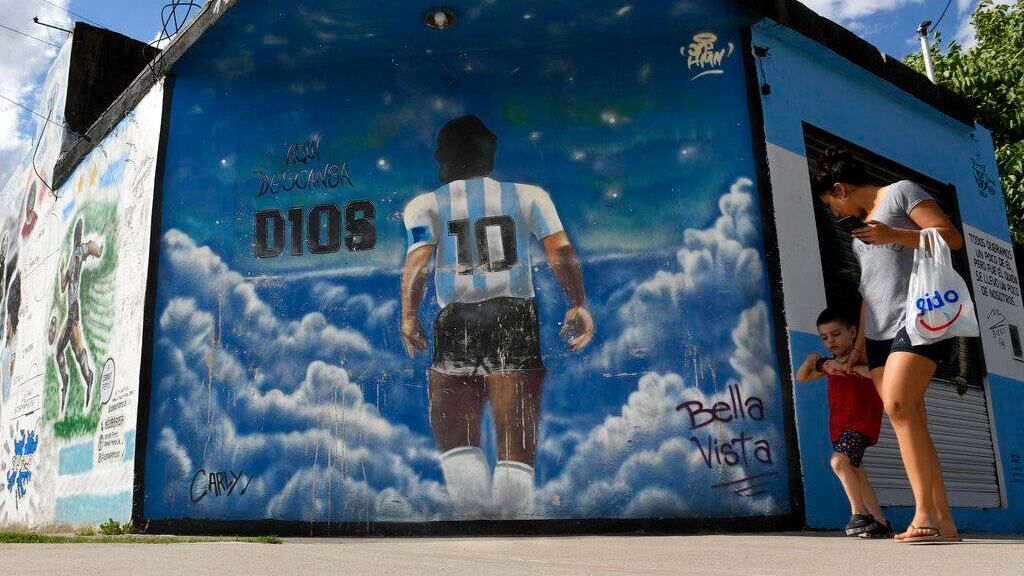 Nada indica que allí descansan los restos del argentino más famoso de la historia. La única referencia está del otro lado de la frondosa arboleda que cerca al cementerio: un mural que retrata episodios de su carrera, como el segundo gol contra Inglaterra en el mundial México 86, y un mensaje: “Todos queríamos un poco de él, pero fue él quien se llevó un poco de nosotros”.