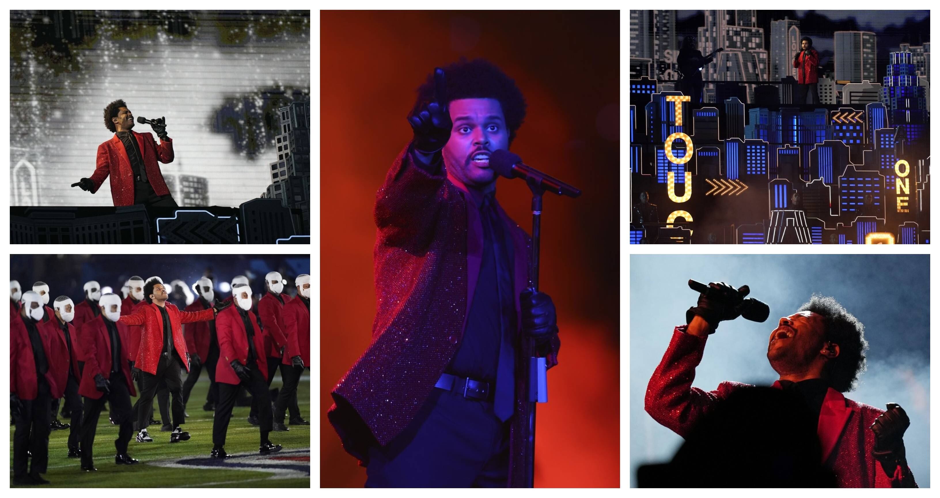 The Weeknd comenzó su set de 14 minutos con sus característicos saco rojo y gafas para sol, dirigiendo a un ensamble robótico y cantando “Call Out My Name”. Su voz nasal y reminiscente de Michael Jackson brilló, especialmente en “The Hills” y “Earned It”, pero la actuación se sintió como si estuviera diseñada para una típica premiación al estilo de los Premios Billboard o los Premios MTV a los Videos Musicales, no para el escenario de Super Bowl.