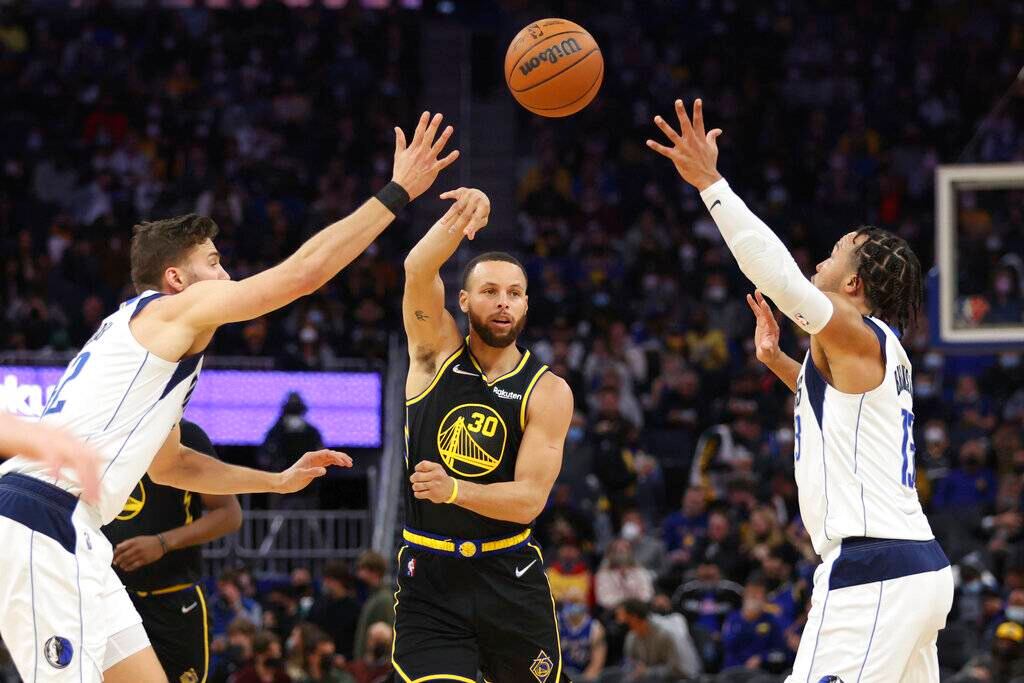 Stephen Curry contabilizó 18 puntos, nueve rebotes y siete asistencias, para que los Warriors de Golden State apabullaran el martes 130-92 a Luka Doncic y a los Mavericks de Dallas.
