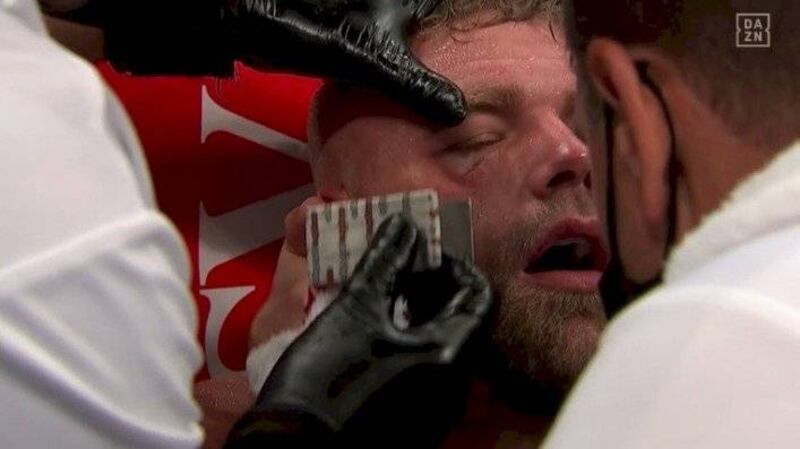 Canelo le conectó un gancho a Saunders que provocó que el pómulo del boxeador británico se inflamara de inmediato, por lo que se alejó hacia las esquinas con la finalidad de ya no recibir más golpes.