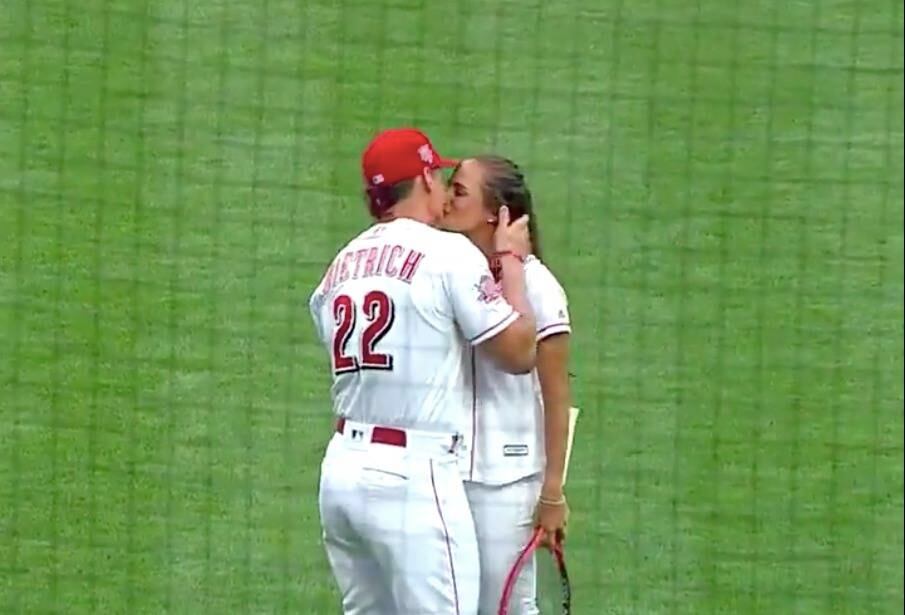 Pero este momento deportivo tuvo un sabor especial para Puig, pues quién le recibió el servicio fue su prometido, el súper utility Derek Dietrich, considerado como el Kike Hernández de los Rojos.