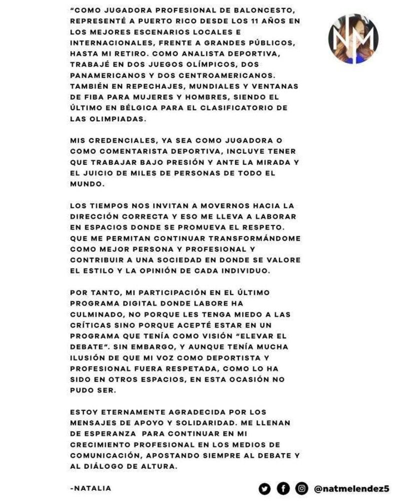 Meléndez resaltó que “los tiempos nos invitan a movernos hacia la dirección correcta y eso me lleva a laborar en espacios donde se promueva el respeto”, en sus declaraciones de hoy, días después de dejar el espacio tras una fuerte discusión con De Playmaker, en el que básicamente no la dejó hablar y ella se fue de la transmisión.
