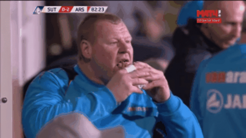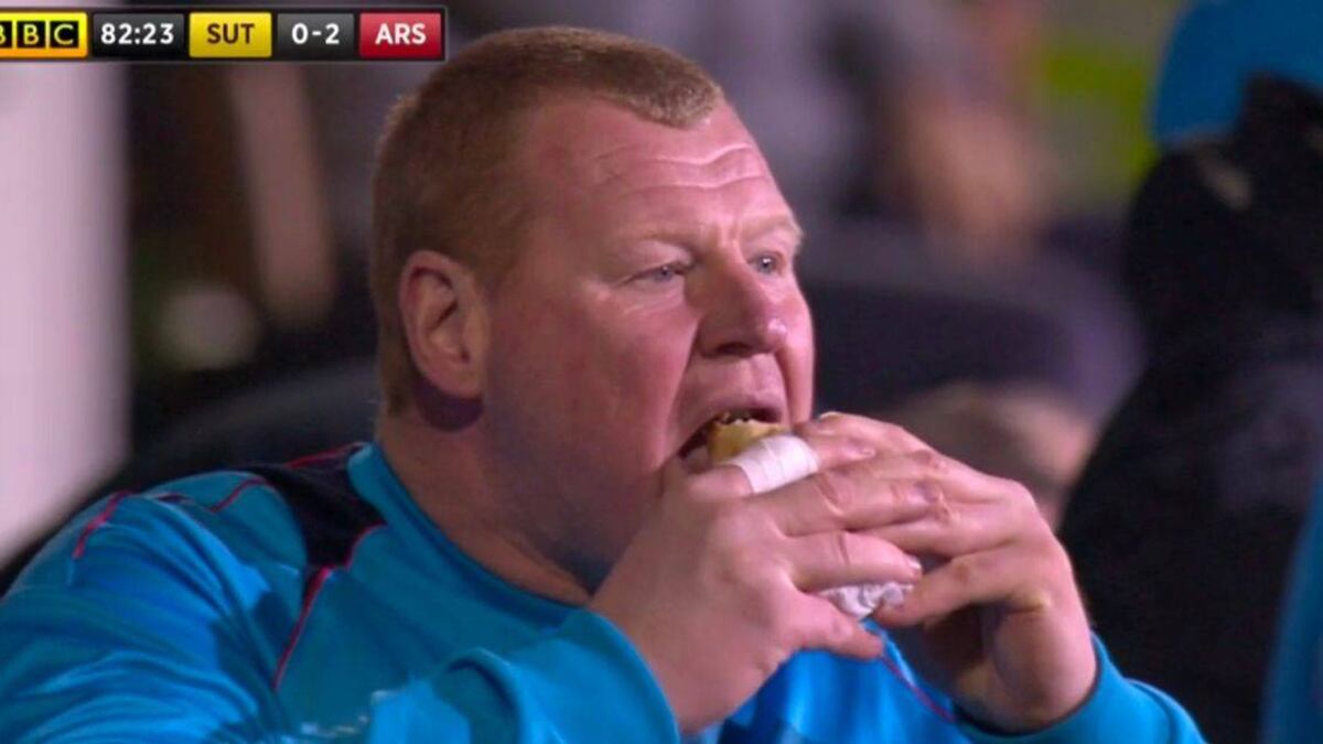 Después que Sutton agotó sus cambios y no había posibilidades de que Shaw entrase al partido, que terminó en una derrota 2-0 ante Arsenal, el regordete portero se comió la empanada sentado en la banca.