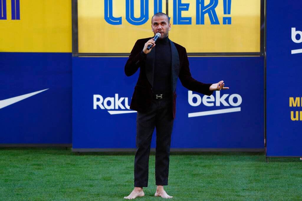 La concurrencia de aficionados fue mayor cuando el presidente del club Joan Laporta presentó a Alves que cuando dieron la bienvenida al nuevo entrenador Xavi Hernández. Alves se quitó las sandalias antes de ingresar al campo.