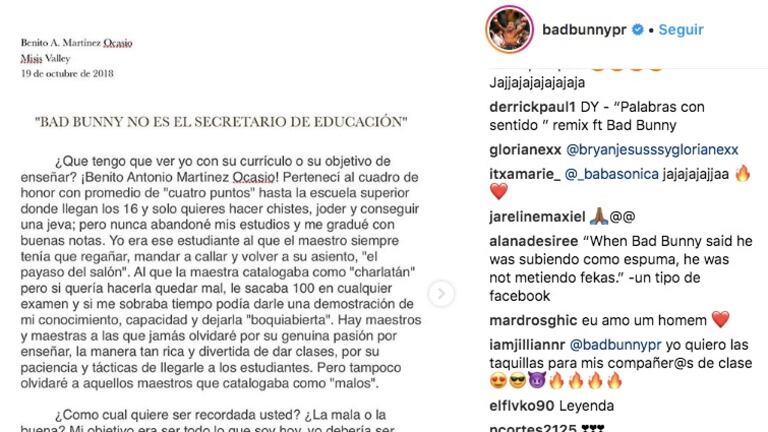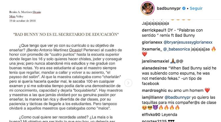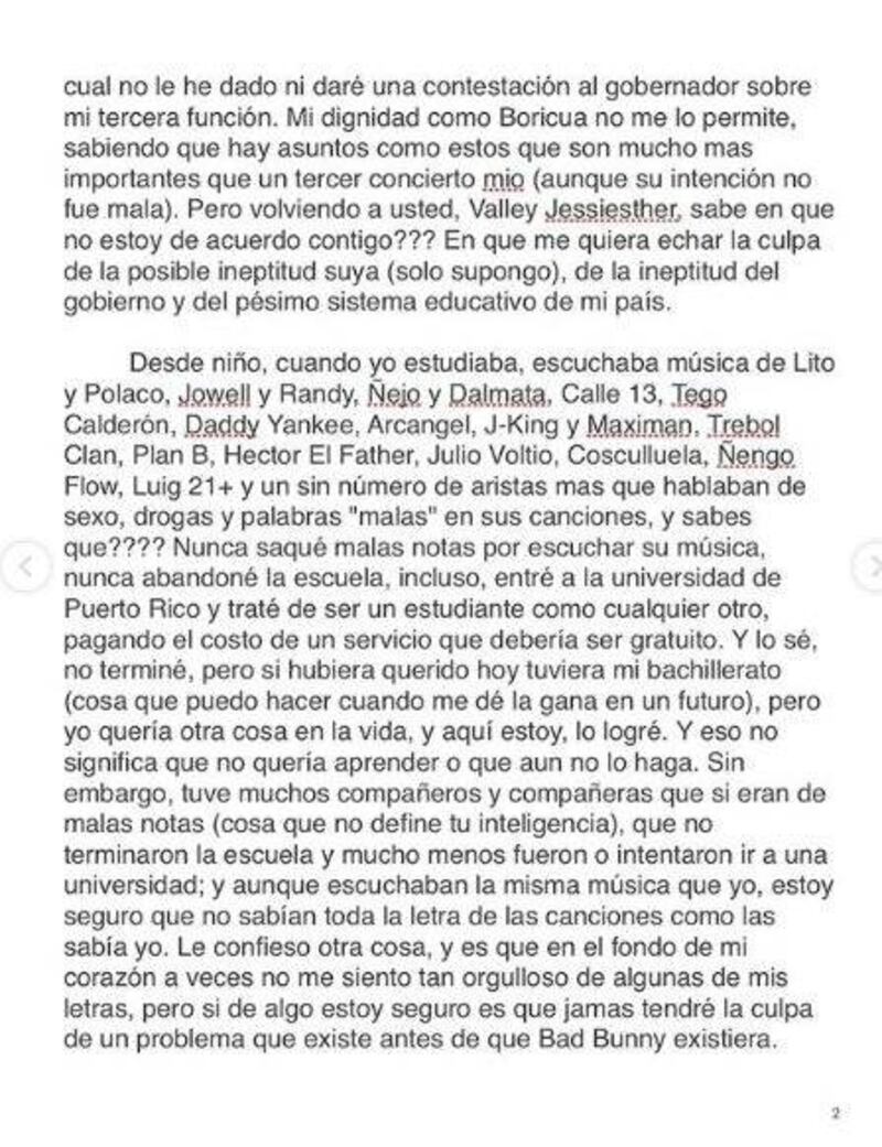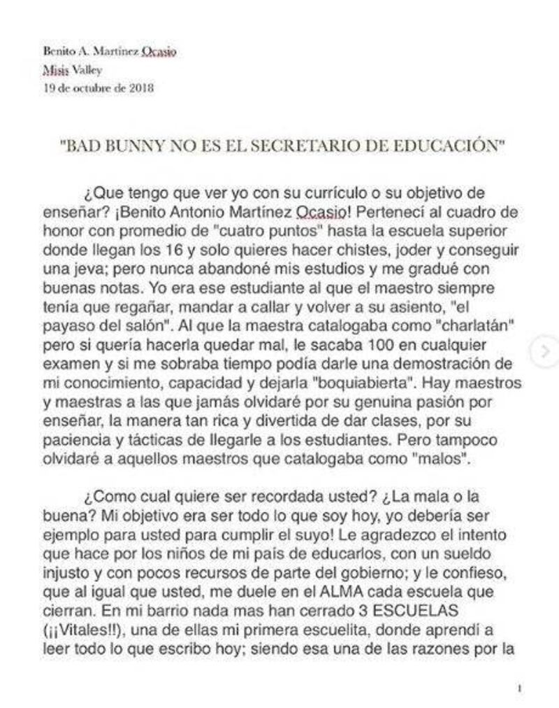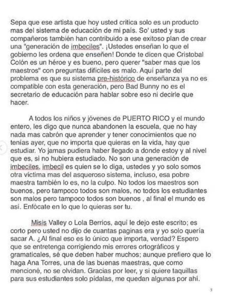 Eso dijo Bad Bunny en una comunicación escrita dirigida hacia una maestra, luego que esta manifestara en una carta que el arte del conejo malo era contraproducente al desarrollo de buenos ciudadanos en Puerto Rico.