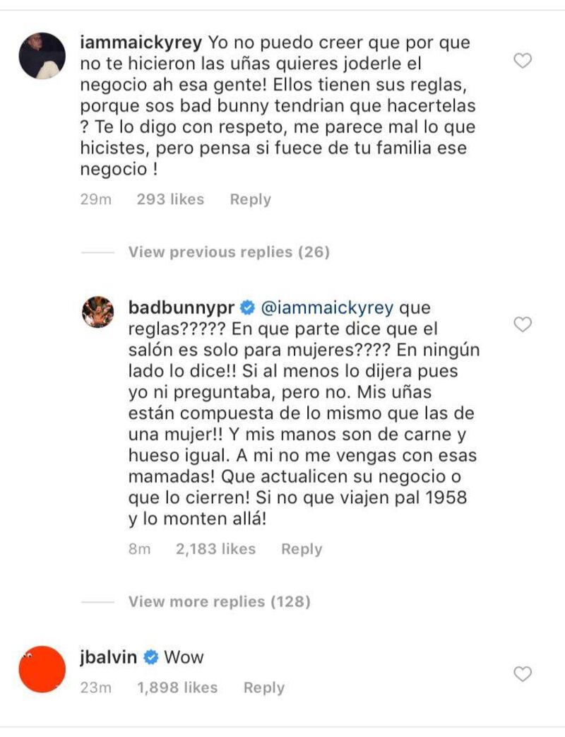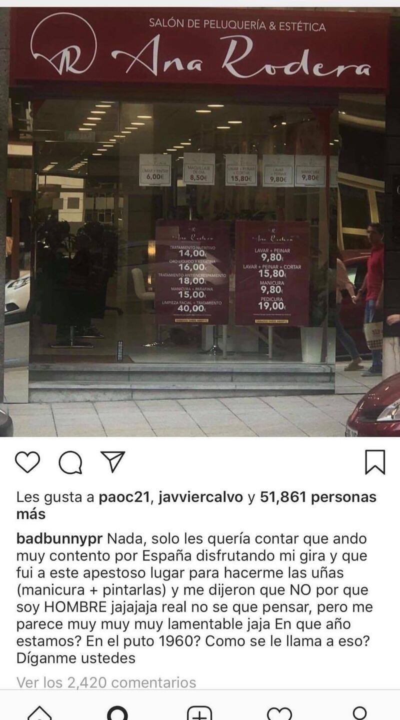 Resulta que algún beautician del Salón de Peluquería y Estética Ana Rodera, con actitud franquista o asediado por la corriente progresista que también seduce a Tata Charbonier le dijo a Benito que por ser hombre no podían trabajarle las uñas. Y Bad Bunny los tiró al medio.