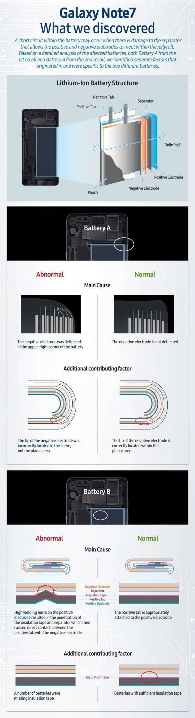 En concreto, la batería A tuvo un problema de diseño en la parte superior derecha, la cual provocaba una desviación en los electrodos negativos, produciendo un sobrecalentamiento. El diseño del Galaxy Note 7 jugó un papel crucial aquí ya que Samsung quiso aprovechar el espacio interno al máximo sin sacrificar el tamaño de batería.
