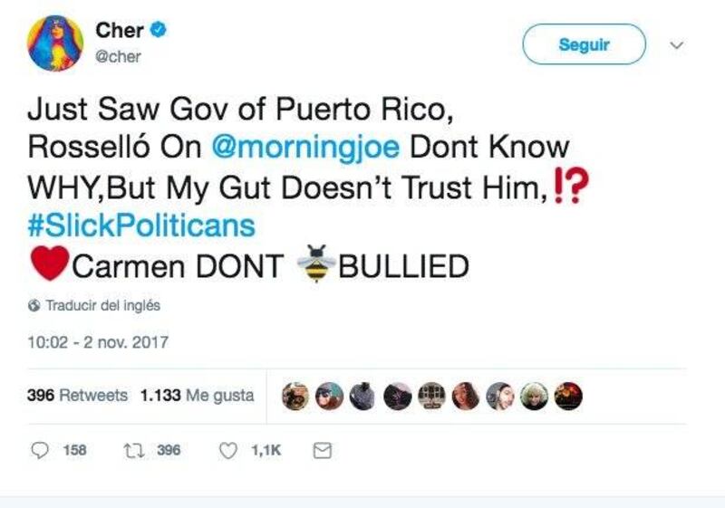 Eso es así. Cher le tiró un barrecampito al Gobe durante la mañana de hoy, jueves, diciendo que lo vio hablando en un programa mañanero y no le creyó mucho que digamos. Y de paso, le echó porras a la alcaldesa Carmen Yulín Cruz, quien es vista en el foro internacional como una de las voces más potentes a la hora de clamar por la causa de Puerto Rico.
