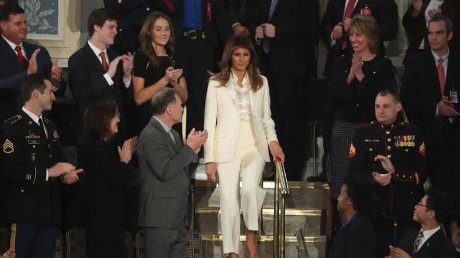 La primera dama Melania Trump eligió un traje sastre de Christian Dior para asistir a al discurso sobre el Estado de la Unión el martes.
