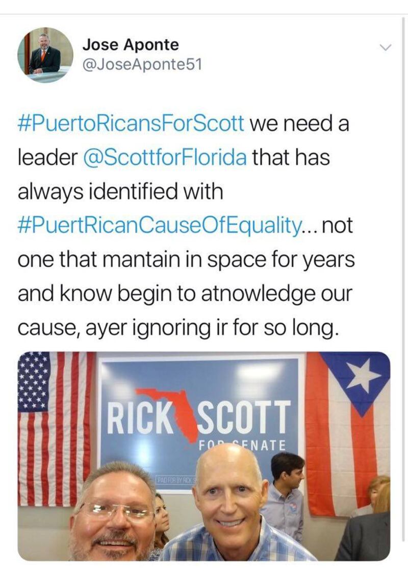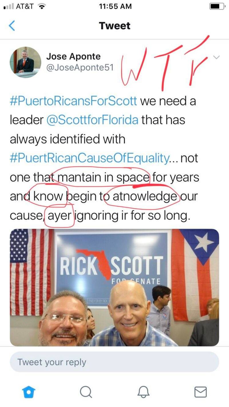Pues el catedrático Primitivo decidió acudir a las redes sociales para instar a los boricuas en Florida a votar por ese gran contendor Rick Scott, actual gobernador de la Florida que busca un escaño ahora en el Senado de los Estados Unidos. En medio de una ráfaga de orejitas tuiteras sobre cómo hablar inglés, nuestro pana Primitivo emitió este mensaje para exhortar a los boricuas en Florida que voten por el republicano Scott.