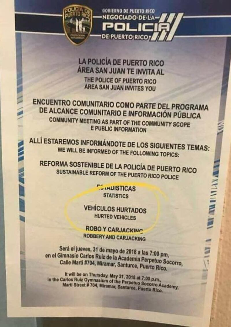 Por supuesto, también en récord con su gran sabiduría en el inglés está el cuerpo de Héctor Pesquera, el cuerpo policiaco, claro está. Ay, los “hurted vehicles”: