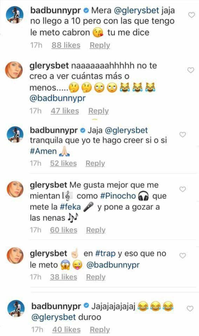 Hace varios días, la animadora Glerysbet Pagán compartió una sensual imagen en su cuenta de Instagram, en la que se le podía ver modelando un sexy g-string que levantó las pasiones de los miles y miles de seguidores que tiene “la verdadera reina de la peseta”. Luego Molusco, quien tiene la manía de tumbarse contenido para ponerlo a correr en sus redes, tiró la foto en su cuenta de Instagram para pescar likes como cosa loca. ¿Qué pasó? A la cuenta de Moluskein llegó el trapero del momento, Bad Bunny, para dar su opinión sobre la estampa.