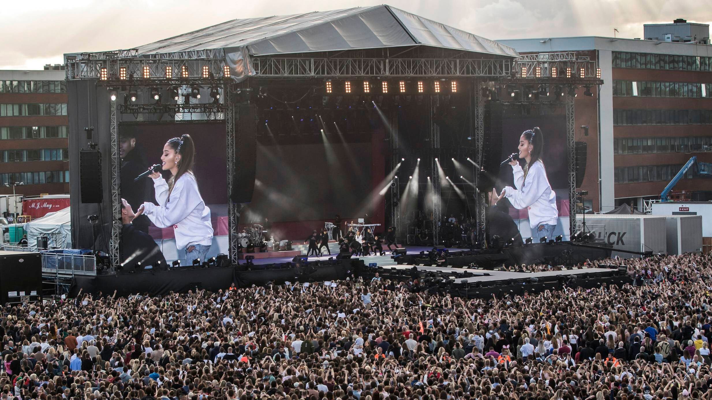 Grande salió al escenario en el concierto denominado One Love Manchester, el cual se realizó en el campo de cricket Old Trafford. La artista estadounidense parecía tener los ojos llorosos y estar emocionada cuando interpretaba “Be Alright” y “Break Free”. Antes de su actuación, ella y su equipo de baile se tomaron de las manos en señal de solidaridad.