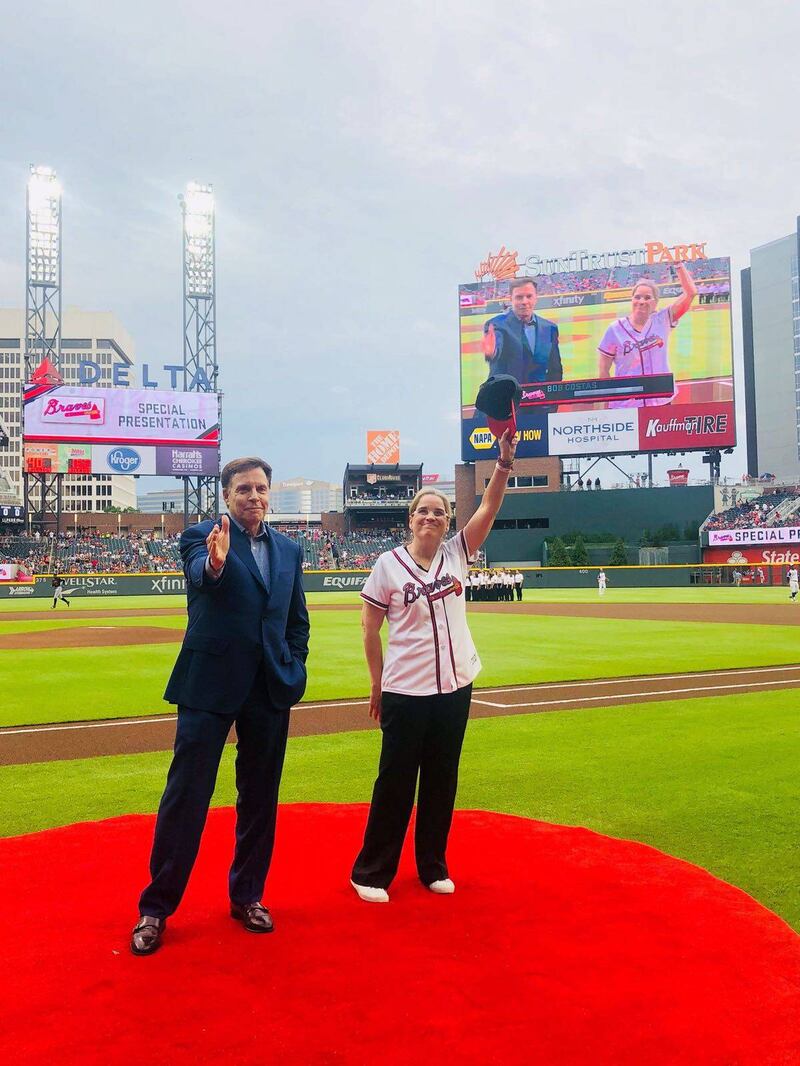 La comandanta suprema del kremlin de San Juan se puso la camiseta de los Bravos de Atlanta y saludó a medio mundo al ladito de Bob Costas, leyenda de la cobertura de la acción de las Mayores.