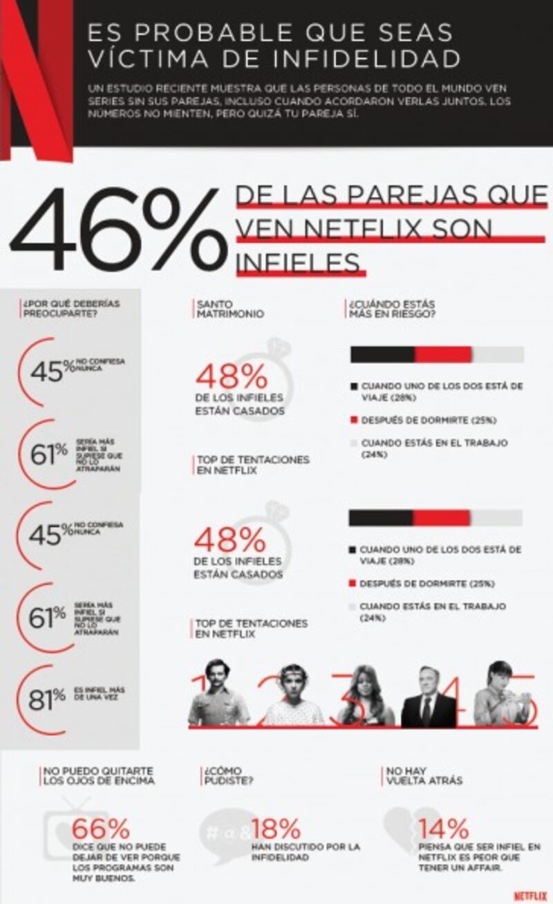Según un estudio desarrollado por Netlix, la infidelidad está muy relacionada con este servicio de streaming. ¿La razón? Que muchas veces nuestra pareja no tiene esa pasión por ver películas series con nosotros, y la adicción que esto genera, nos lleva a ponerles el cuerno. Pero calma, no se trata de otra persona, sino de esconderse del otro para evitar que nos cachen dedicándole nuestro desvelo al catálogo de este servicio.