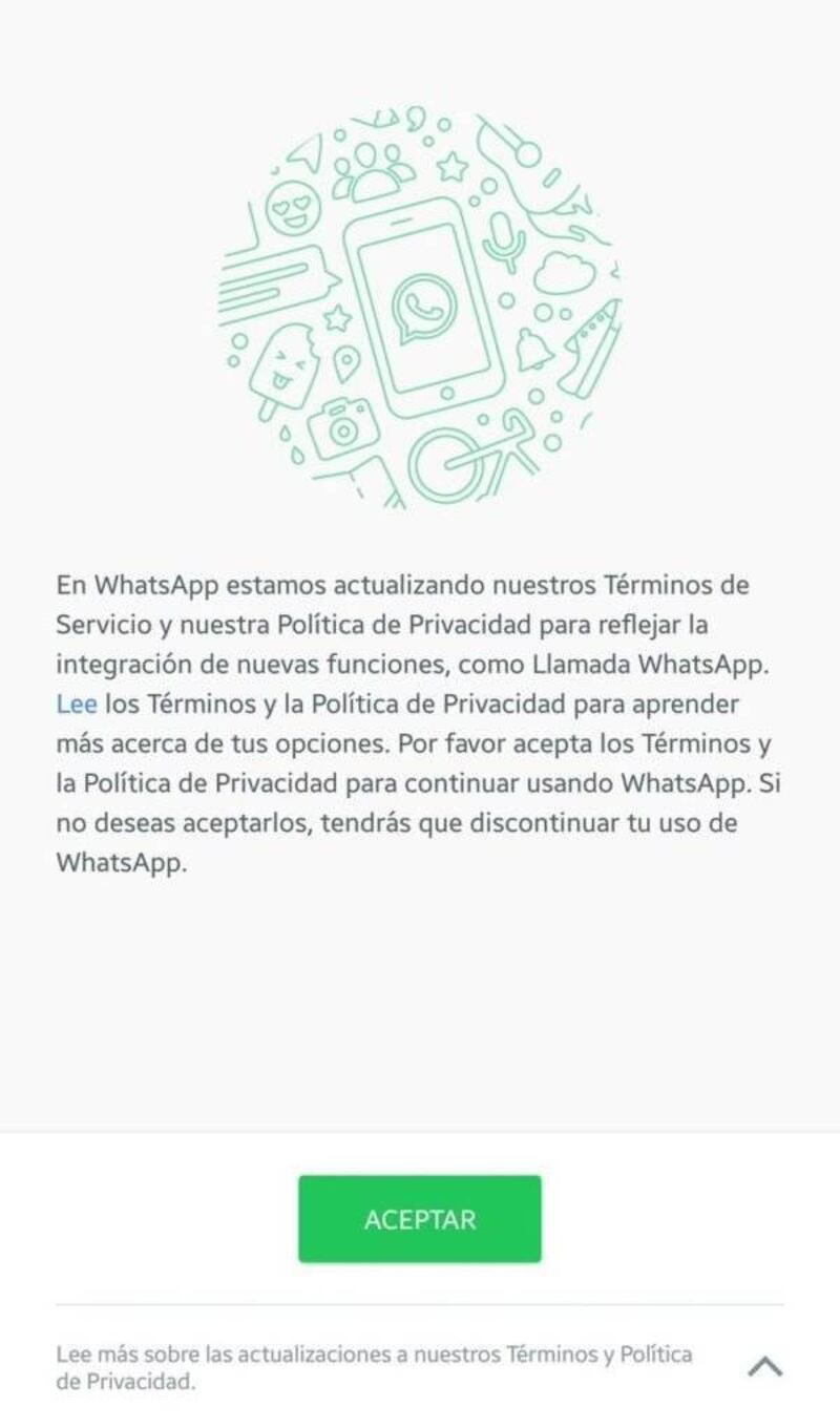 La noticia llega desde XatakaMóvil, quienes se han percatado que ahora la aplicación presenta el aviso sobre los nuevos cambios al iniciar sesión, pero a diferencia de la vez anterior ya solo queda aceptar, pues así mismo lo especifican: “si no deseas aceptarlos, tendrás que discontinuar tu uso de WhatsApp.”