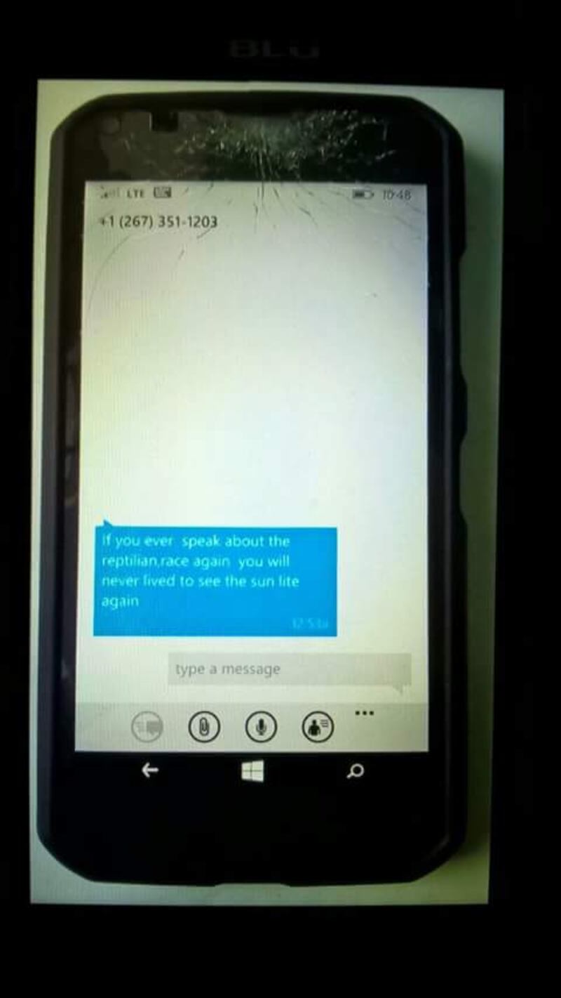 Supuestamente, la 'amenaza' fue originada de un número teléfonico en Botswana, África y el mensaje lo recibió mientras participaba de un programa de radio en los Estados Unidos mientras él afirmaba que Hillary Clinton, si llegaba a la Presidenta iba a reconocer la presencia de extraterrestres y que declararía oficialmente su existencia.