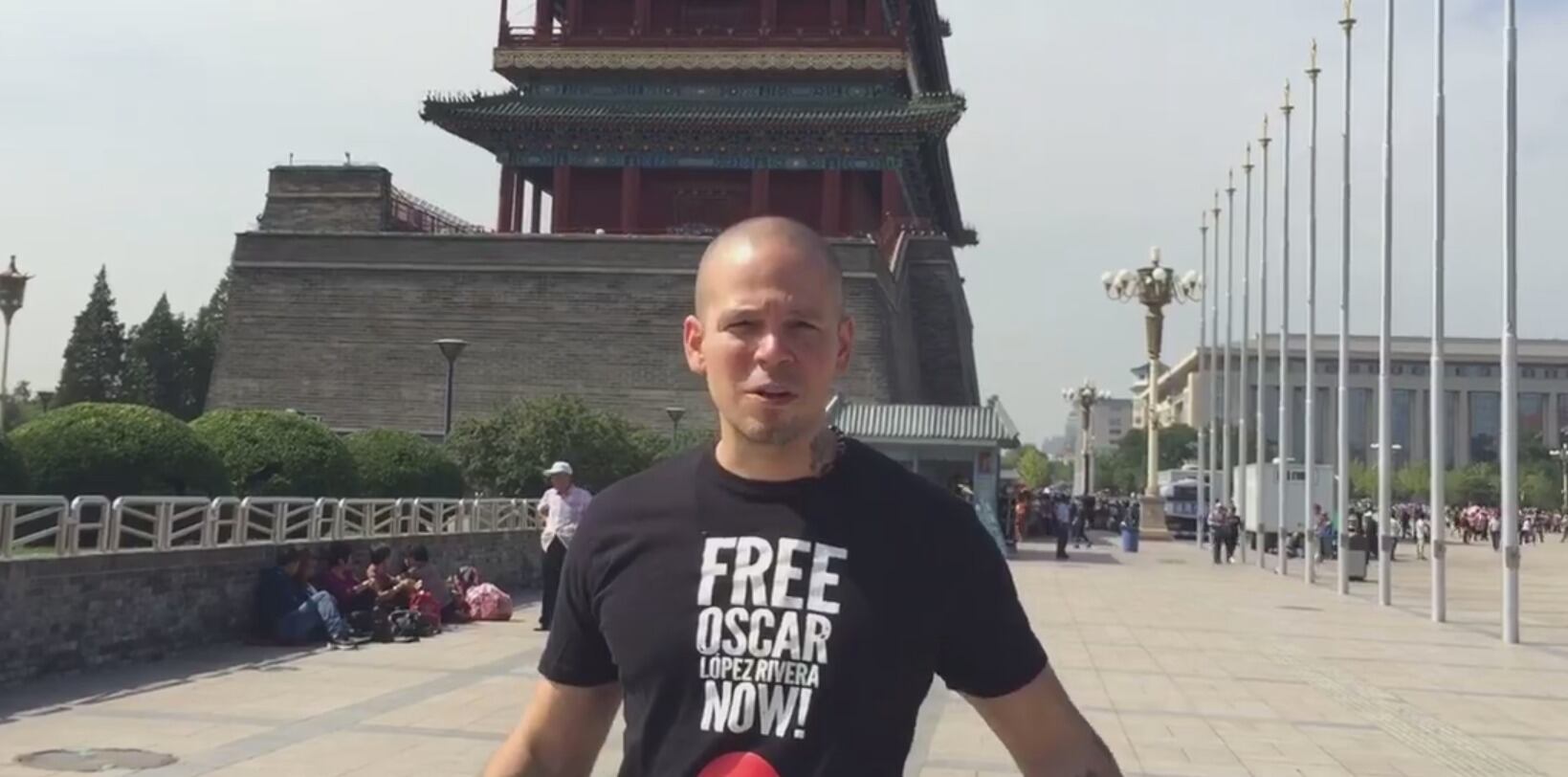 “Hoy, 23 de septiembre, además de celebrar el Grito de Lares en Puerto Rico, el papa Francisco se va a ver con el presidente Obama”, comienza el mensaje grabado desde Beijing y el cual continúa pidiendo al público que apoyen a los boricuas y que se hagan sentir para que para el papa “hable con Obama sobre la excarcelación de Oscar López Rivera que está preso en Estados Unidos. Ya lleva 34 años preso… Todos queremos la libertad de Oscar (López)”.