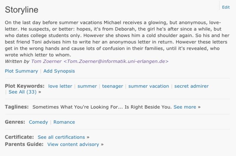 “En el último día de clases antes de las vacaciones de verano, Michael recibe una romántica pero anónima carta de amor. Él sospecha, o al menos espera que la carta haya sido escrita por Deborah, la chicha de la que ha estado interesado por mucho tiempo, pero que sólo sale con chicos de universidad. Su mejor amiga, Toni, le aconseja responder con otra carta anónima. Sin embargo, las cartas caen en manos ajenas y causan confusión en sus familias, hasta que finalmente se revela quienes son los verdaderos autores.”