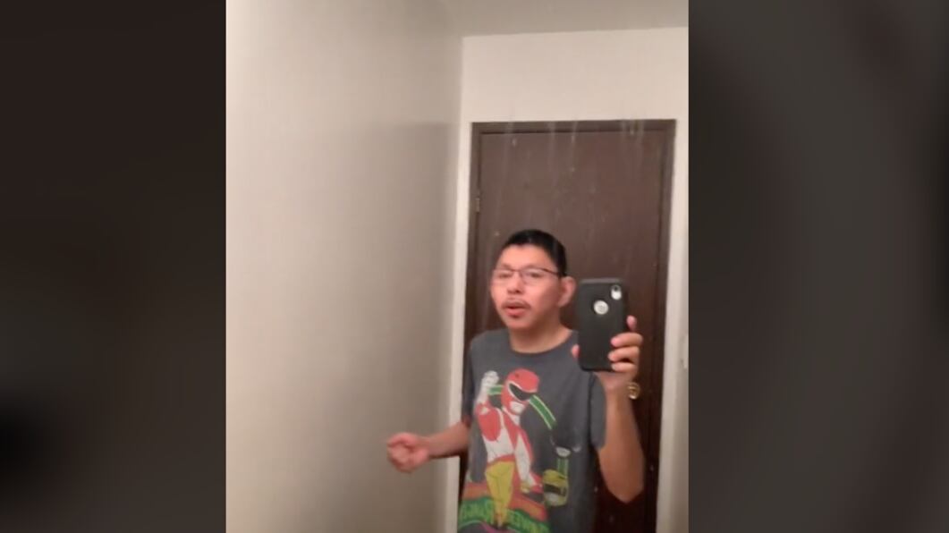 Primero se enfoca el lavabo del baño y luego el espejo donde baila luciendo una camiseta de los Power Rangers. Puede ser su gracia, estilo o simplemente su naturalidad lo que llevo a este video que se viralizara.