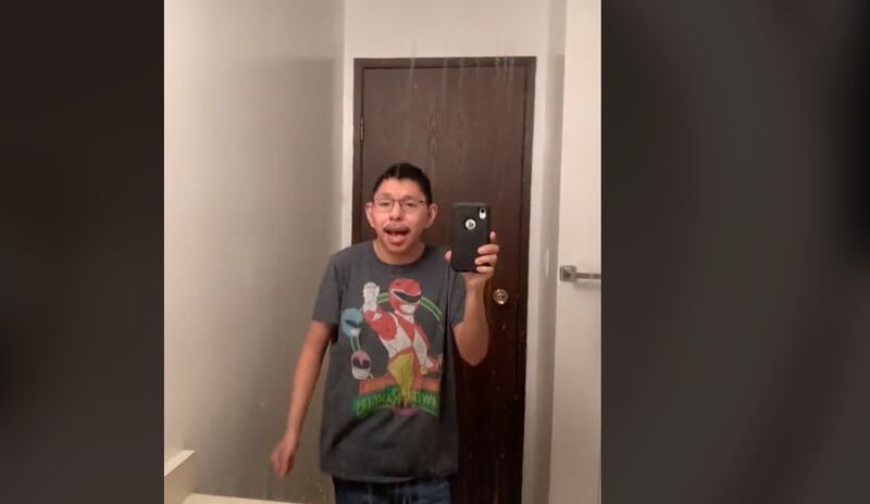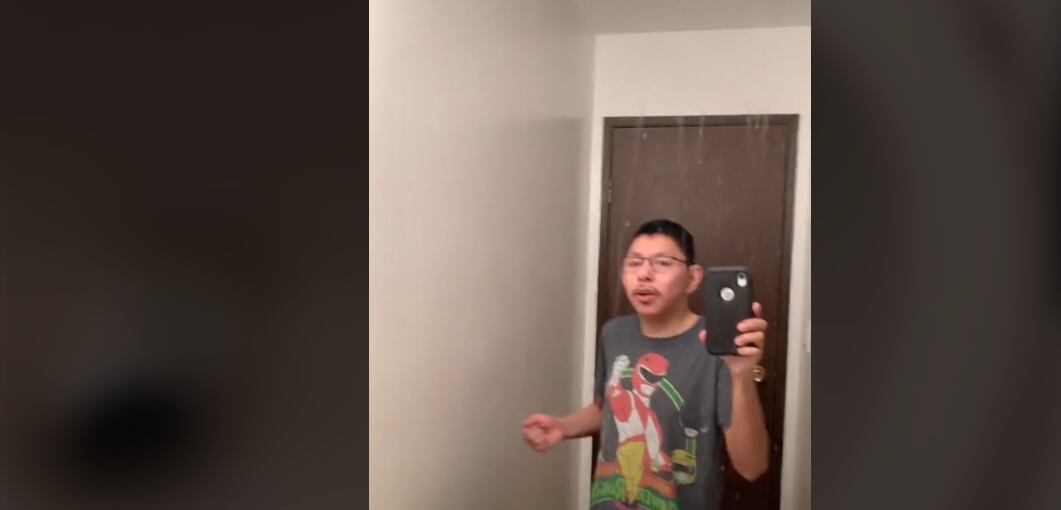 Primero se enfoca el lavabo del baño y luego el espejo donde baila luciendo una camiseta de los Power Rangers. Puede ser su gracia, estilo o simplemente su naturalidad lo que llevo a este video que se viralizara.