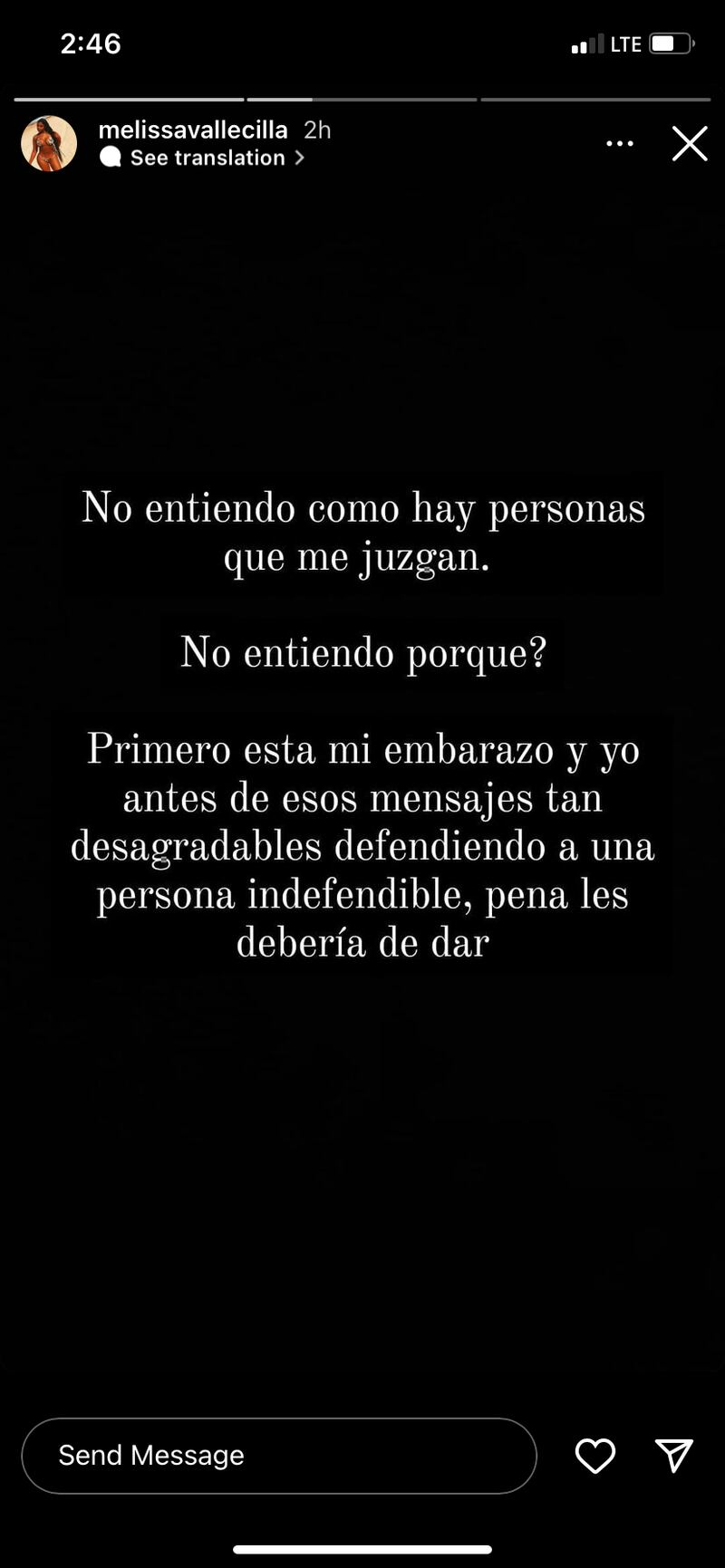 “Como Dios no se equivoca dejaré todo en sus manos. La verdad siempre saldrá a la luz. No entiendo cómo hay personas que me juzgan. No entiendo porqué. Primero está mi embarazo y yo antes de esos mensajes tan desagradables, defiendo a una persona indefendible, pena les debería dar”, escribió la mujer en varias historias de Instagram.