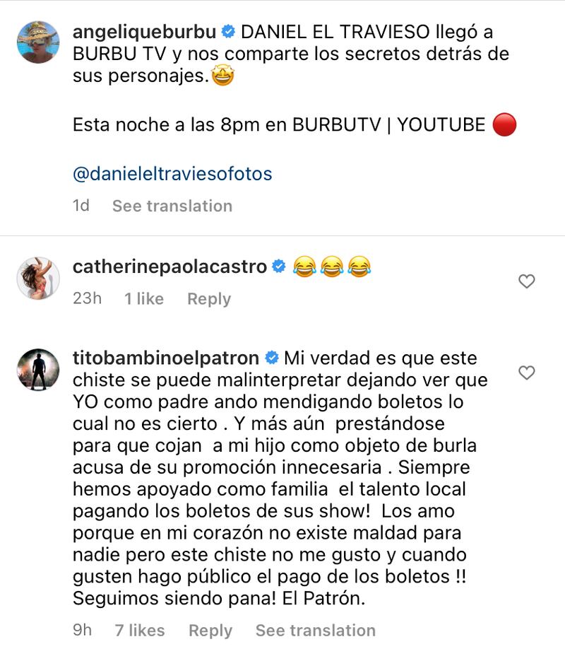 “Mi verdad es que este chiste se puede malinterpretar dejando ver que YO como padre ando mendingando boletos lo cual no es cierto. Y más aún prestándose para que cojan a mi hijo como objeto de burla acusa (sic.) de su promoción innecesaria. Siempre hemos apoyado como familia el talento local pagando los boletos de sus shows! Los amo porque en mi corazón no existe maldad para nadie pero este chiste no me gustó y cuando gusten hago público el pago de los boletos!! Seguimos siendo pana! El Patrón (sic.)”, expresó Tito El Bambino.