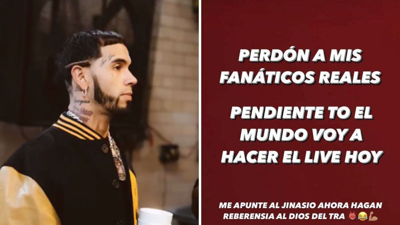El “dios del tra’” y líder de los cacos con pollina de indios taínos, le está dando duro al gym aunque no sepa cómo rayos escribir esa palabra en buen español. A través de sus historias de Instagram, Anuel AA anunció a sus fanáticos que estaría haciendo un ‘live’, pero eso no es lo importante, ya que en una línea más abajo escribió: “ME APUNTE AL JINASIO AHORA HAGAN REBERNSIA AL DIOS DEL TRA (sic.)”.