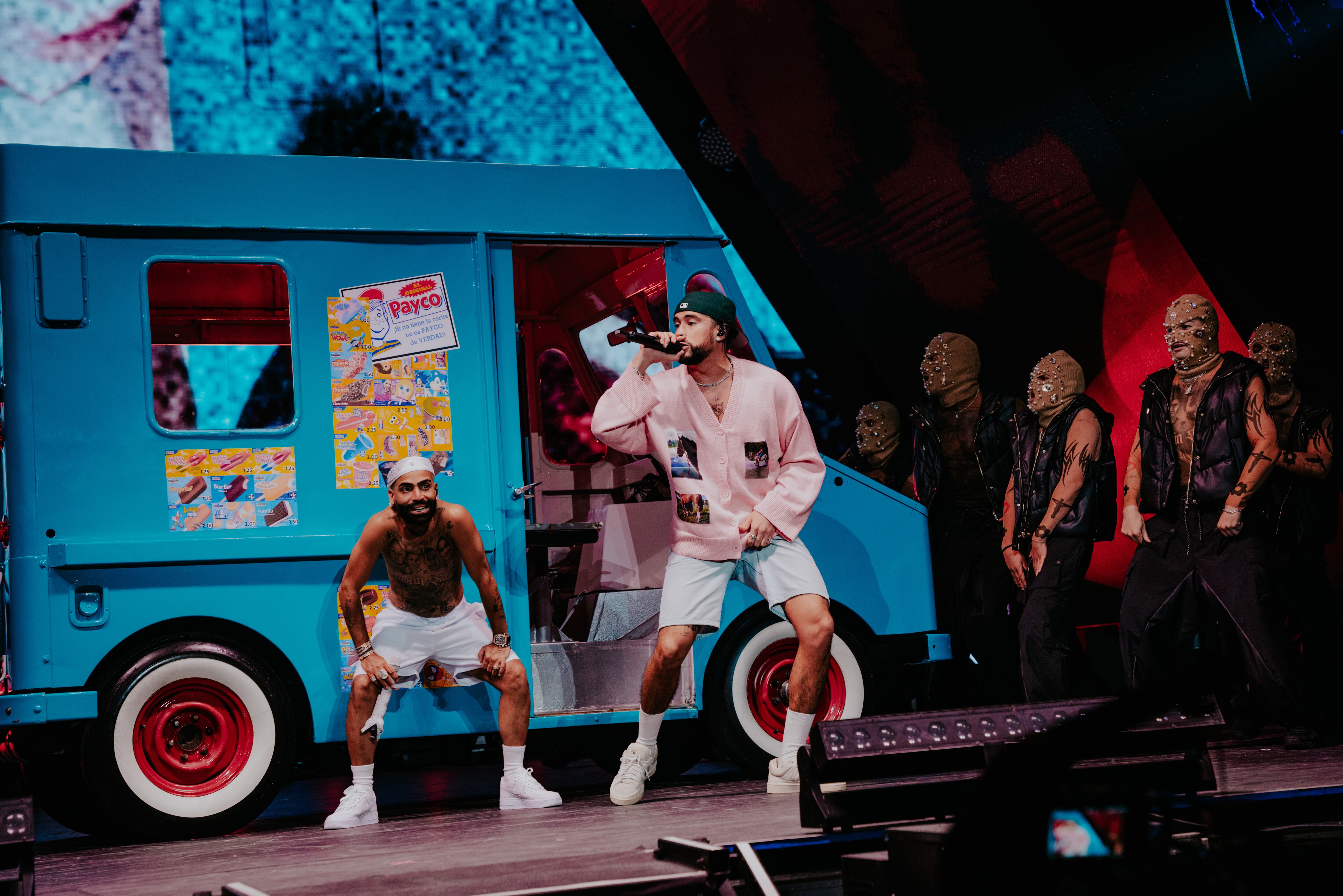 Bad Bunny apareció junto a Arcángel en la guagua de helados que han utilizado durante todas las funciones del concierto para cantar el tema “Tú no vives así”. La aparición de Bad Bunny provocó euforia en los 18 mil fanáticos que se encontraban en el Choliseo.