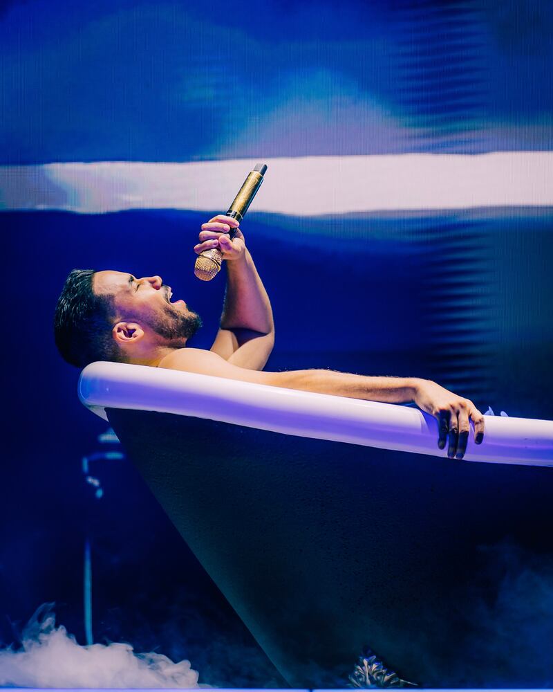 La primera despedida del artista fue al cantar “Obsesión”. Pero regresó a la tarima de forma sorpresiva, al subir en una bañera desde donde cantó semidesnudo “Sus Huellas”.