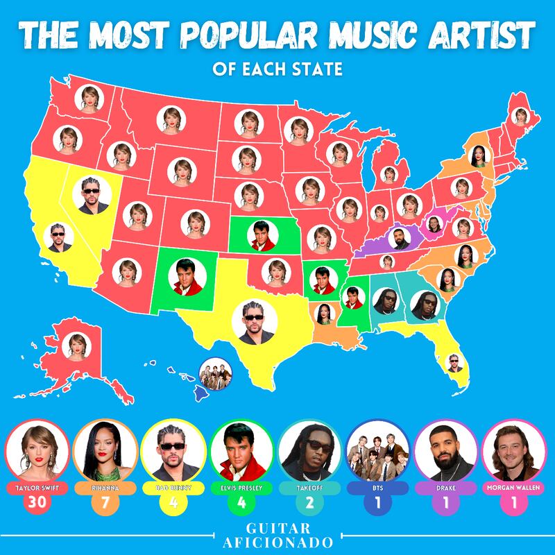 El sitio entusiasta de la guitarra Guitar Aficionado, analizó los datos de transmisión de Spotify para medir los artistas más transmitidos durante el año pasado en los Estados Unidos y luego analizó cuáles de estos artistas eran los más buscados en cada estado estadounidense.