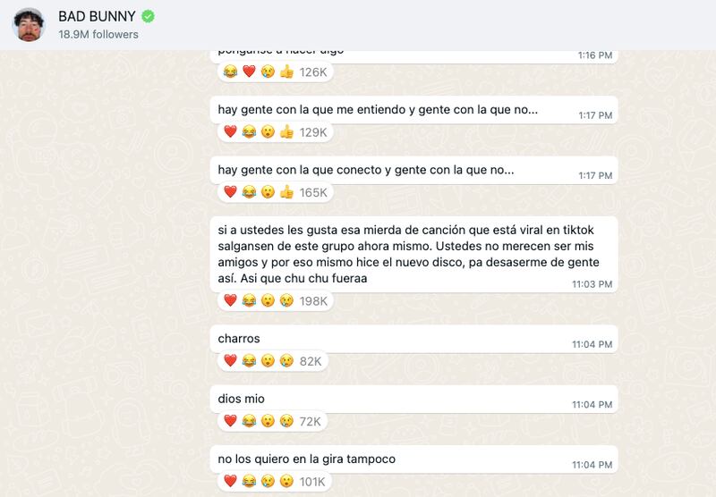 A través de su canal de Whats App, Benito Antonio Martínez Ocasio, le dejó saber a sus fanáticos su molestia con una canción que está viral en TikTok y que al parecer le ha quitado atención a su álbum: “Nadie sabe lo que va a pasar mañana”.