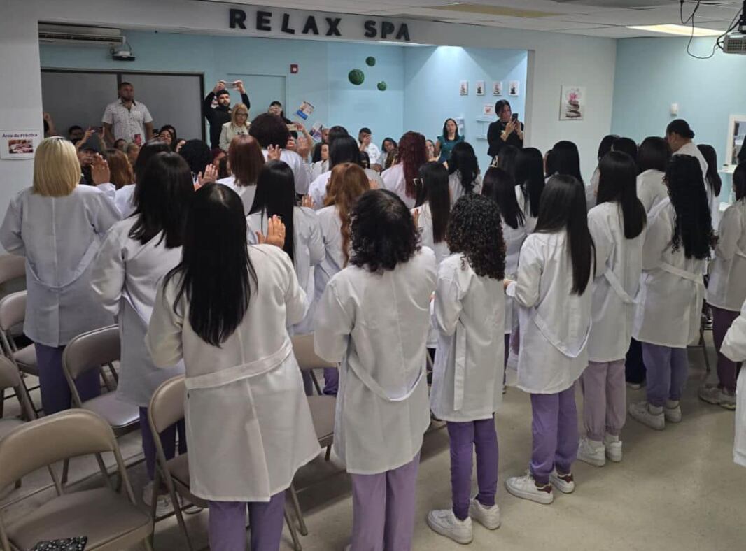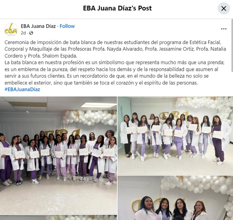 “Ceremonia de imposición de bata blanca de nuestras estudiantes del programa de Estética Facial, Corporal y Maquillaje de las Profesoras Profa. Nayda Alvarado, Profa. Jessamine Ortiz, Profa. Natalia Cordero y Profa. Shalom Espada. La bata blanca en nuestra profesión es un simbolismo que representa mucho más que una prenda; es un emblema de la pureza, del respeto hacia los demás y de la responsabilidad que asumen al servir a sus futuros clientes. Es un recordatorio de que, en el mundo de la belleza no solo se embellece el exterior, sino que también se toca el corazón y el espíritu de las personas”, lee la publicación.