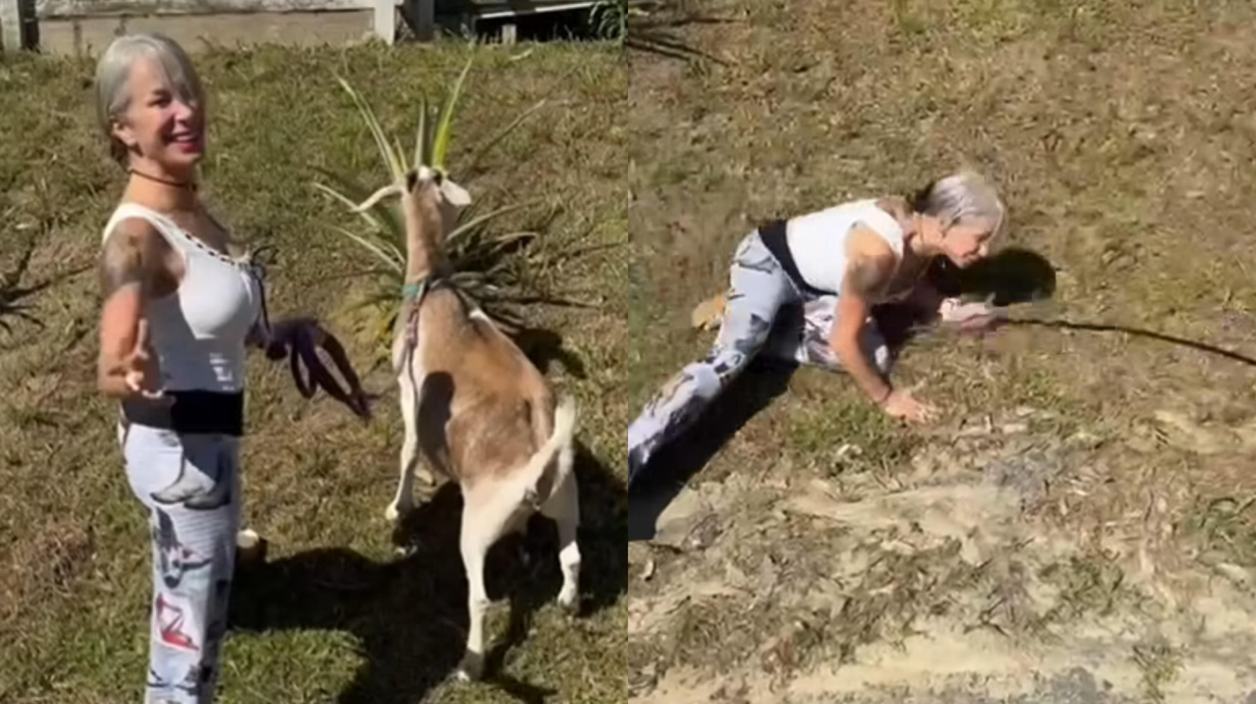 Fue a través de sus redes sociales que el presentador publicó un video que capturó el momento donde la animadora pregunta: “¿Qué hacemos con ella (señalando a la cabra)?”. Acto seguido, el animal, llamado “Gárgola”, empieza a correr, provocando que la actriz y comediante cayera al suelo.