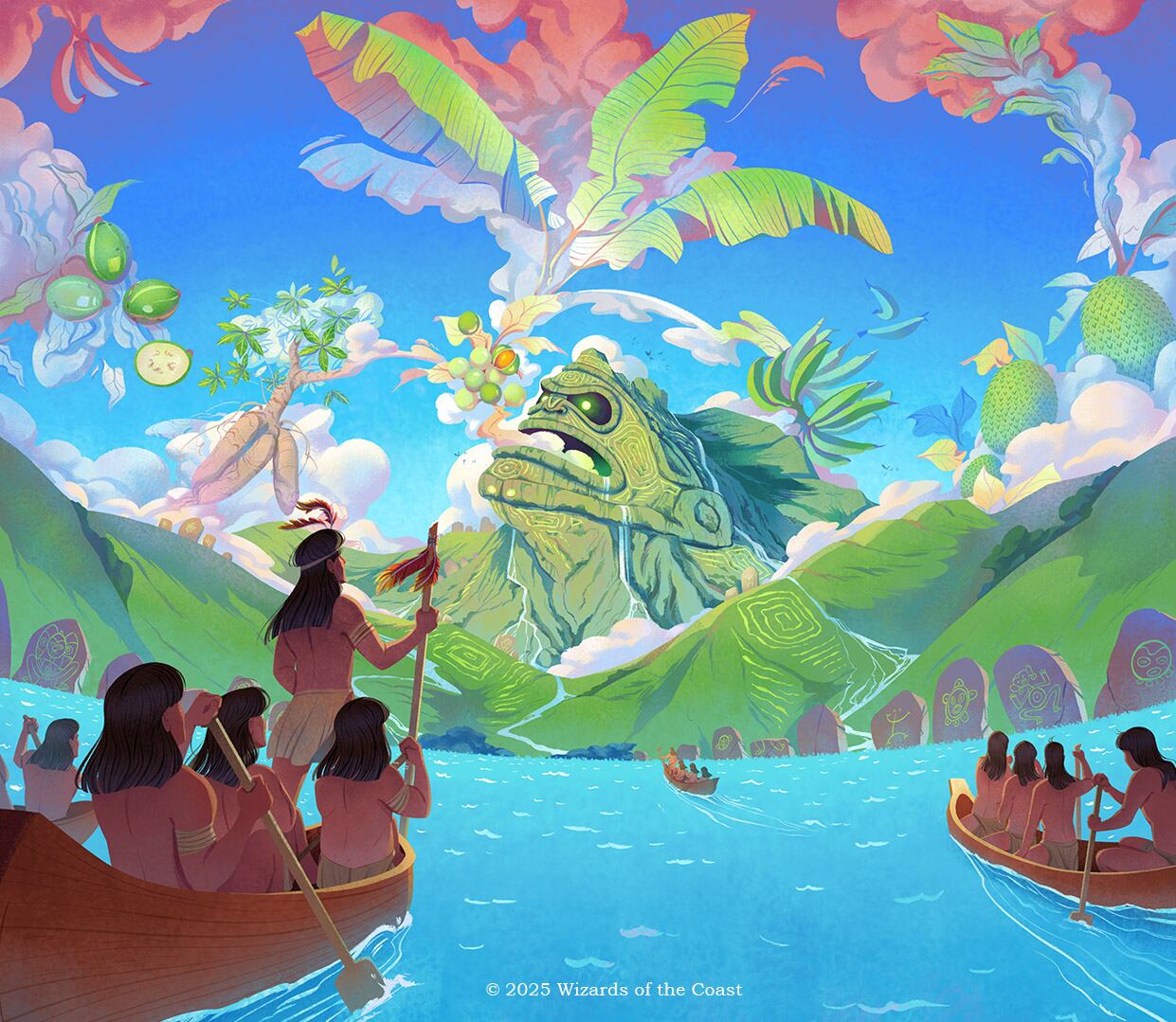 La ilustradora de 30 años contó en entrevista con El Calce que Wizards of the Coast la contactó con la idea de que el arte fuera sobre Yucajú, también conocido como Yukiyú, y, con toda la libertad creativa a lo largo de un mes, la ilustradora dejó el balance de los tonos verdes, rosas y azul del Caribe reflejados en la carta.