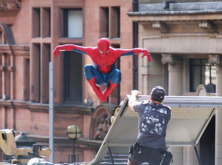 En las calles de Glasgow, Escocia, Spider-Man camina con total naturalidad, como si fueran su propio cuartel general.