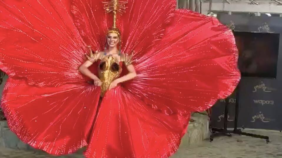 Madison Anderson Berríos lució su ángel con elegancia en conferencia de prensa. Luego de las críticas por su español, la muchacha ha comenzado a convencer a expertas y misiólogos. El traje está inspirado en el coquí y en la Flor de Maga.