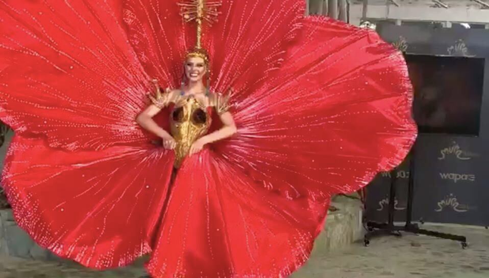 Madison Anderson Berríos lució su ángel con elegancia en conferencia de prensa. Luego de las críticas por su español, la muchacha ha comenzado a convencer a expertas y misiólogos. El traje está inspirado en el coquí y en la Flor de Maga.