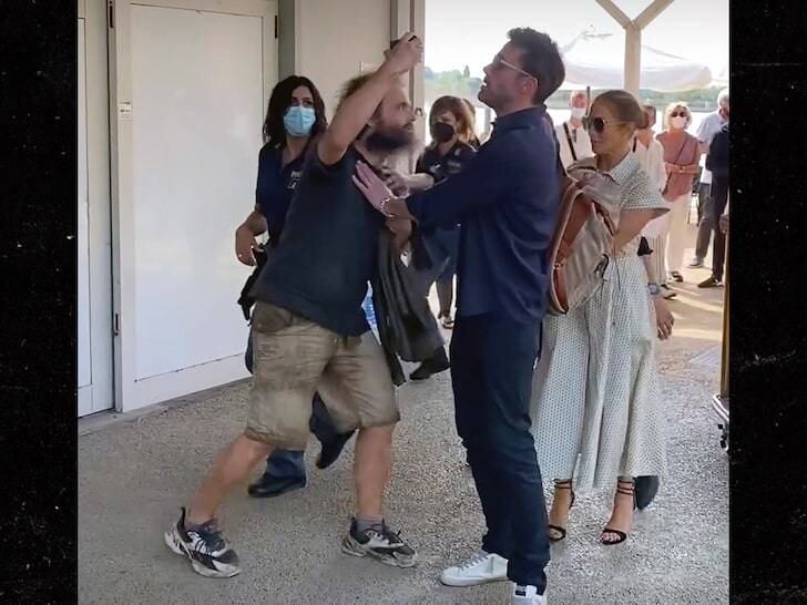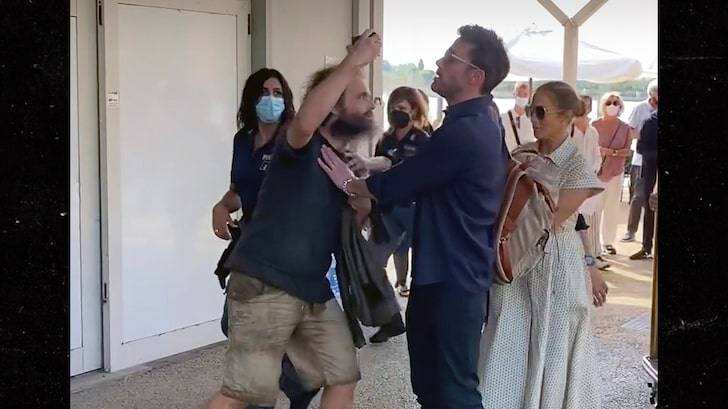 En Venecia, el actor tuvo que intervenir con un fanático que buscaba tomarse una fotografía con la cantante invadiendo el espacio de estos y evadiendo la seguridad de ambos.