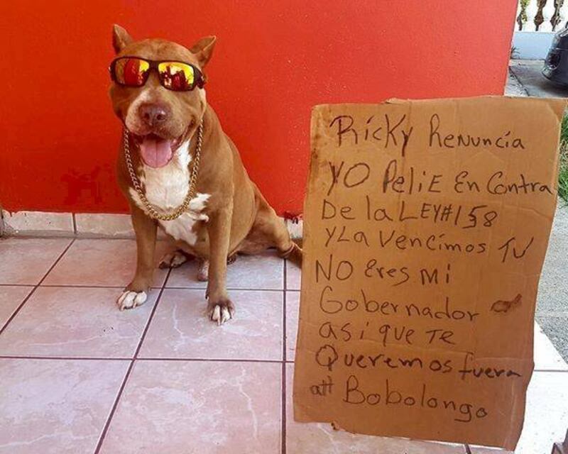 “Ricky renuncia. Yo pelié [SIC] en contrá de la Ley #158 y la vencimos. Tú no eres mi Gobernador, así que te queremos fuera. Att, Bobolongo”, apuntó el líder sindical de los perritos vegabajeños quien estuvo de punto de la lanza de la Federación de Perritos de Vega Baja durante las lucha contra esta maligna ley que hubiese discriminado en contra de los perritos, las perritas y les perrites pitbulls de haber sido aprobada.