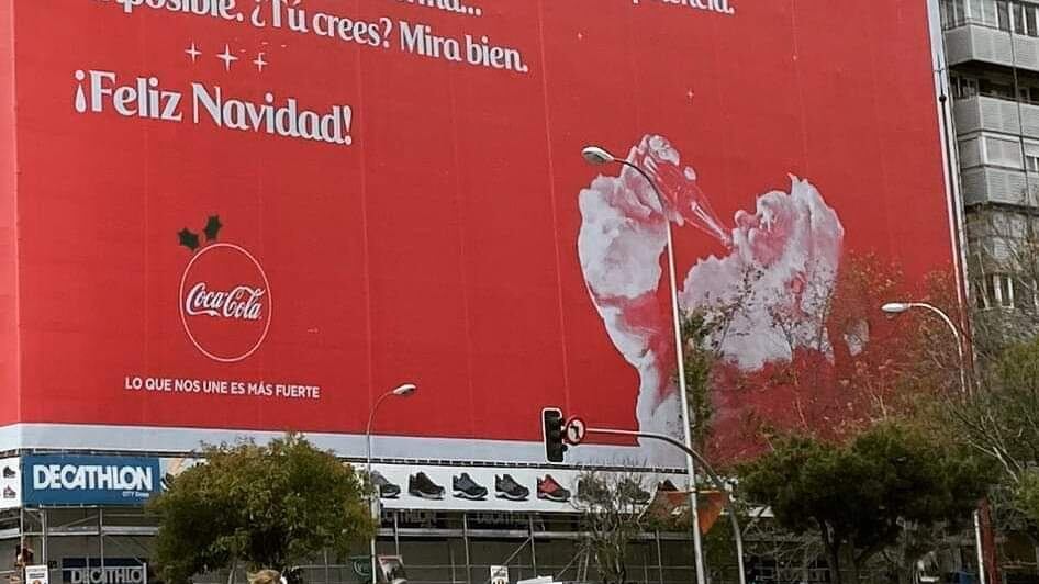En el país europeo, Coca Cola colocó enormes carteles en ciudades como Madrid, Málaga, Valencia y Bilbao, los cuales a simple vista, parecen un mensaje navideño convencional, con un bonachón Viejo Pascuero tomándose una bebida.