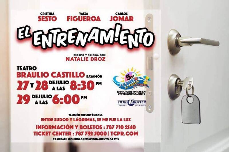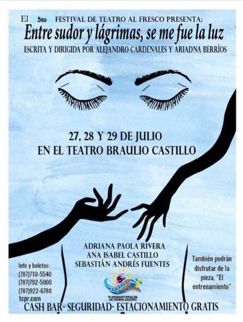 Esta noche culmina el último fin de semana del 5to Festival de Teatro al Fresco, en el Teatro Braulio Castillo en Bayamón. Las dos piezas que cerraran el festival veraniego serán “Entre sudor y lágrimas, se me fue la luz” con Adriana Rivera, Sebastián Fuentes y Ana Castillo y “El Entrenamiento” con Cristina Sesto, Yaiza Figueroa y Carlos Jomar.