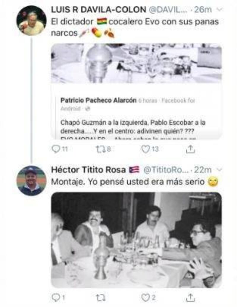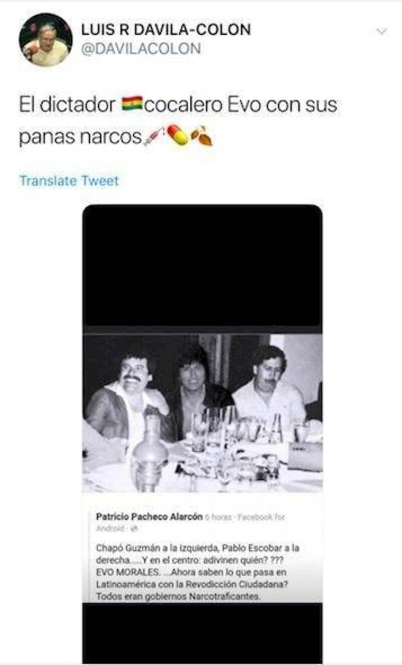 La gente tiene que entender que nadie es perfecto, que uno se equivoca y que a veces le caen pajas a la leche. El señor Luis Dávila Colón, por ejemplo, sufrió un episodio lamentable en sus redes sociales. Particularmente, en su cuenta de Twitter, donde publicó —SIN QUERER QUERIENDO— una foto editada en la que se aprecia al expresidente de Bolivia, Evo Morales, junto a los narcotraficantes Pablo Escobar y Chapo Guzmán.