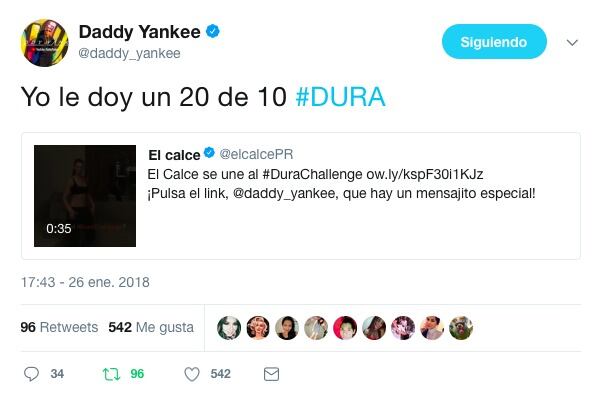 El señor Daddy Yankee – empresario, rapero, reguetonero, estrella de cine, expelotero, ganador de Grammys, hacedor de discos platino, comedor de arroz con pollo, padre de Don Omar y orgullo de Villa Kennedy – le dio “un 20 de 10” al intrépido #DuraChallenge de El Calce.