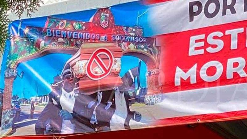 “Por decreto municipal, queda estrictamente prohibido morirse por Coronavirus en este municipio”, se lee en la lona de aproximadamente 10 metros de largo por tres de ancho, la cual va acompañado de la imagen de un cortejo fúnebre (un grupo de africanos cargando un ataúd), señalizado con un círculo rojo con una línea diagonal.