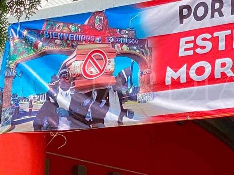 “Por decreto municipal, queda estrictamente prohibido morirse por Coronavirus en este municipio”, se lee en la lona de aproximadamente 10 metros de largo por tres de ancho, la cual va acompañado de la imagen de un cortejo fúnebre (un grupo de africanos cargando un ataúd), señalizado con un círculo rojo con una línea diagonal.