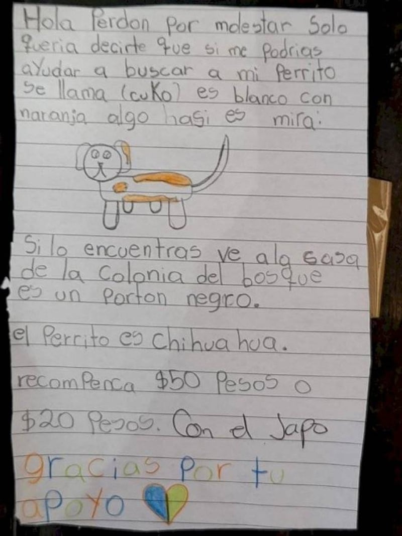 “Hola, perdón por molestar, solo quería decirte que si me podrías ayudar a buscar a mi perrito, se llama Cuko, es blanco con naranja, algo así, mira”, señalaba el escrito de la menor, en donde dibujó al can.