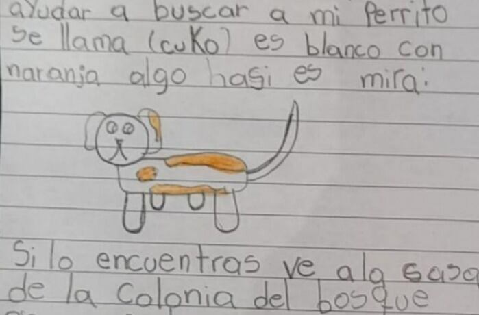 “Hola, perdón por molestar, solo quería decirte que si me podrías ayudar a buscar a mi perrito, se llama Cuko, es blanco con naranja, algo así, mira”, señalaba el escrito de la menor, en donde dibujó al can.